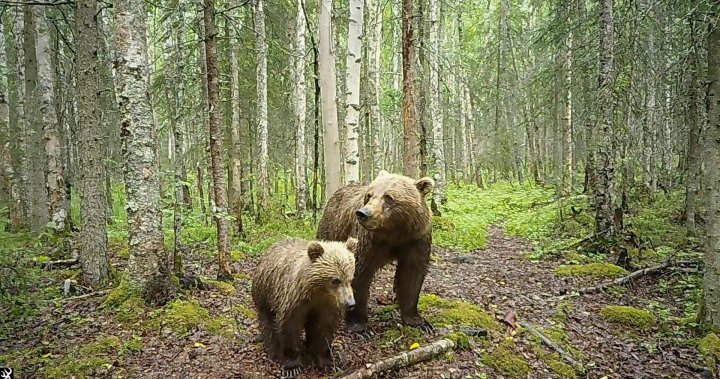 Image made from video provided by Donna Gail Shaw shows a view from a trail camera of a brown bear and cubs on July 25, 2023, in Anchorage, Alaska.